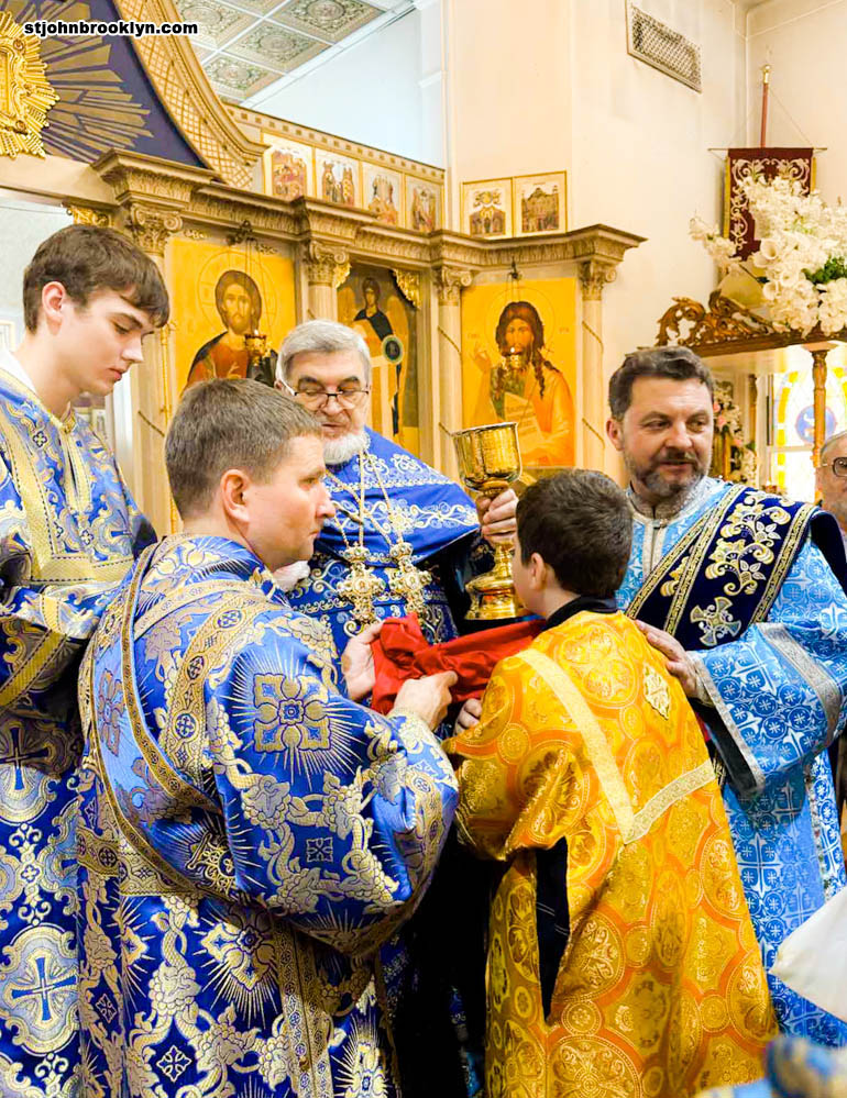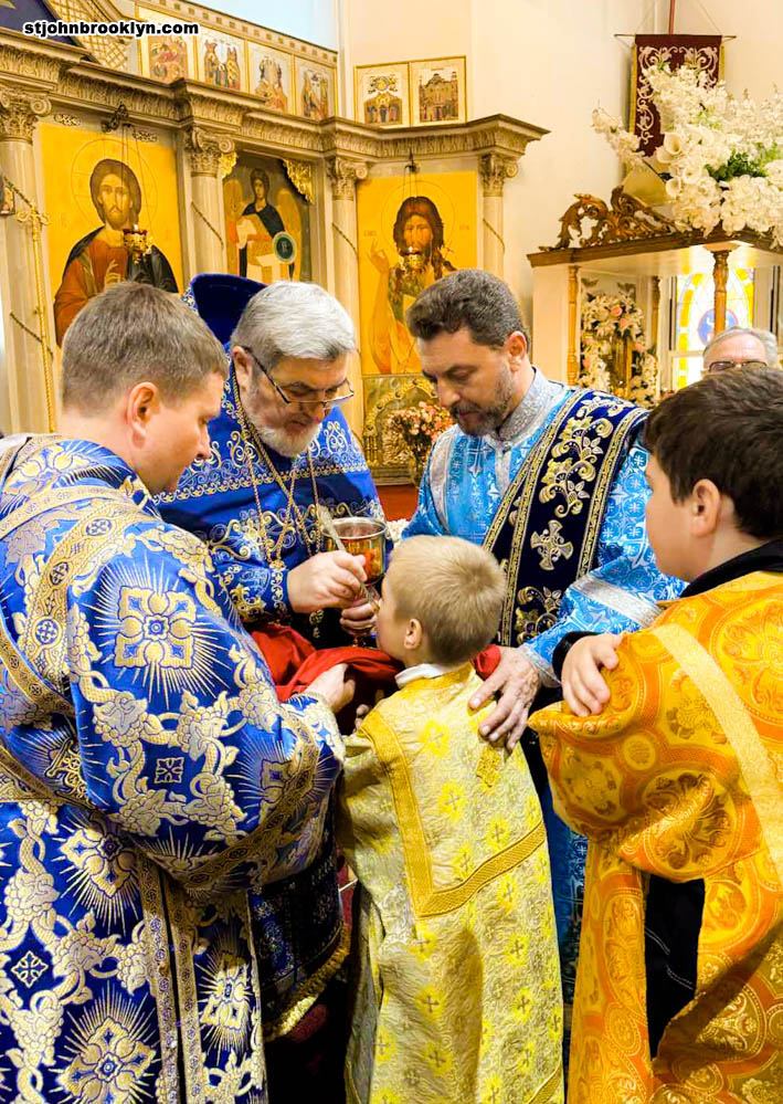 Божественную литургию совершил настоятель протопресвитер Вселенского престола Александр Беля в сослужении клириков храма протоиереев Бориса Бабешко, Василия Деяка, Петра Прокопцова, протодиаконов Владимира Олейника и Георгия Хиро.